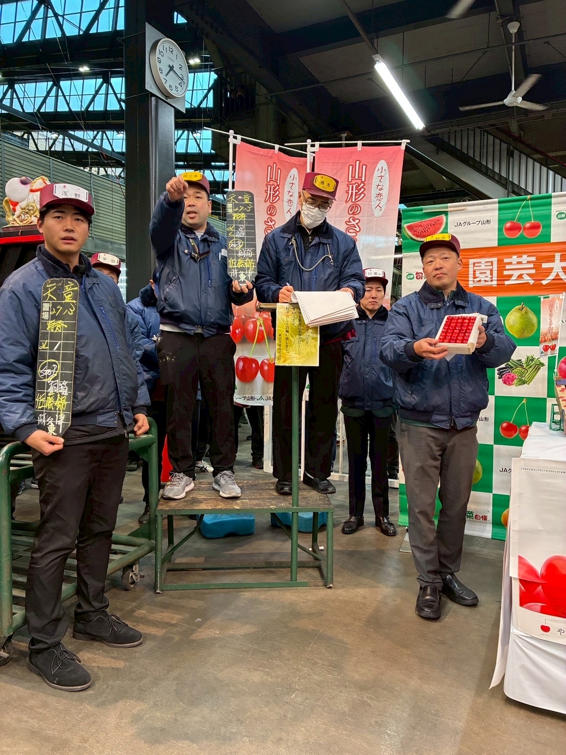 山形県天童市で超促成栽培されたさくらんぼ「佐藤錦」の初せりが5日、東京・大田市場で行われました。